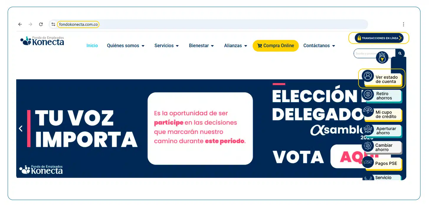 Ingresa a www.fondokonecta.com.co a la » Zona Transaccional o ver estado de cuenta «