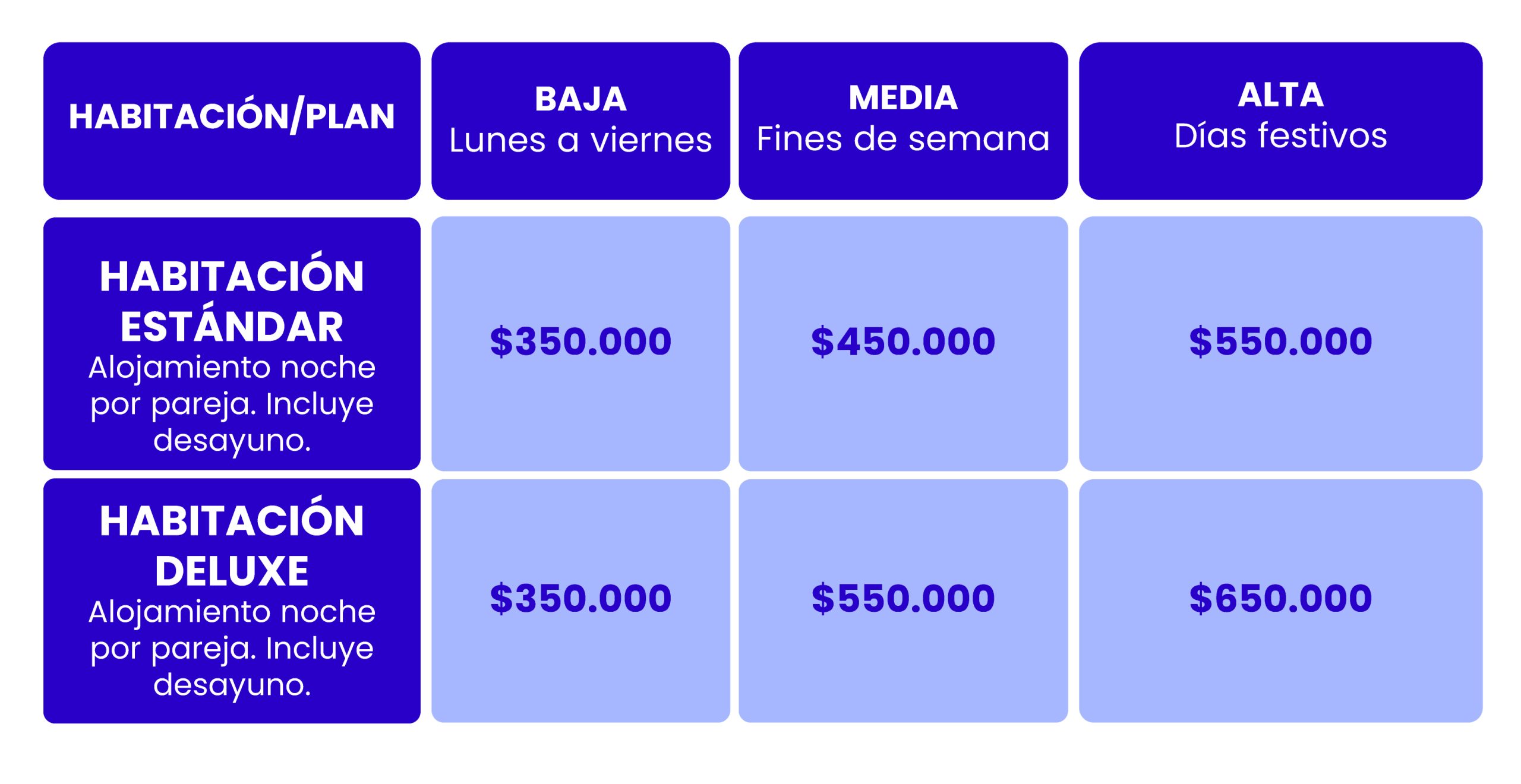 Salida anticipada: Aplica penalidad equivalente al cobro de una (1) noche alojamiento a la tarifa de la temporada.
