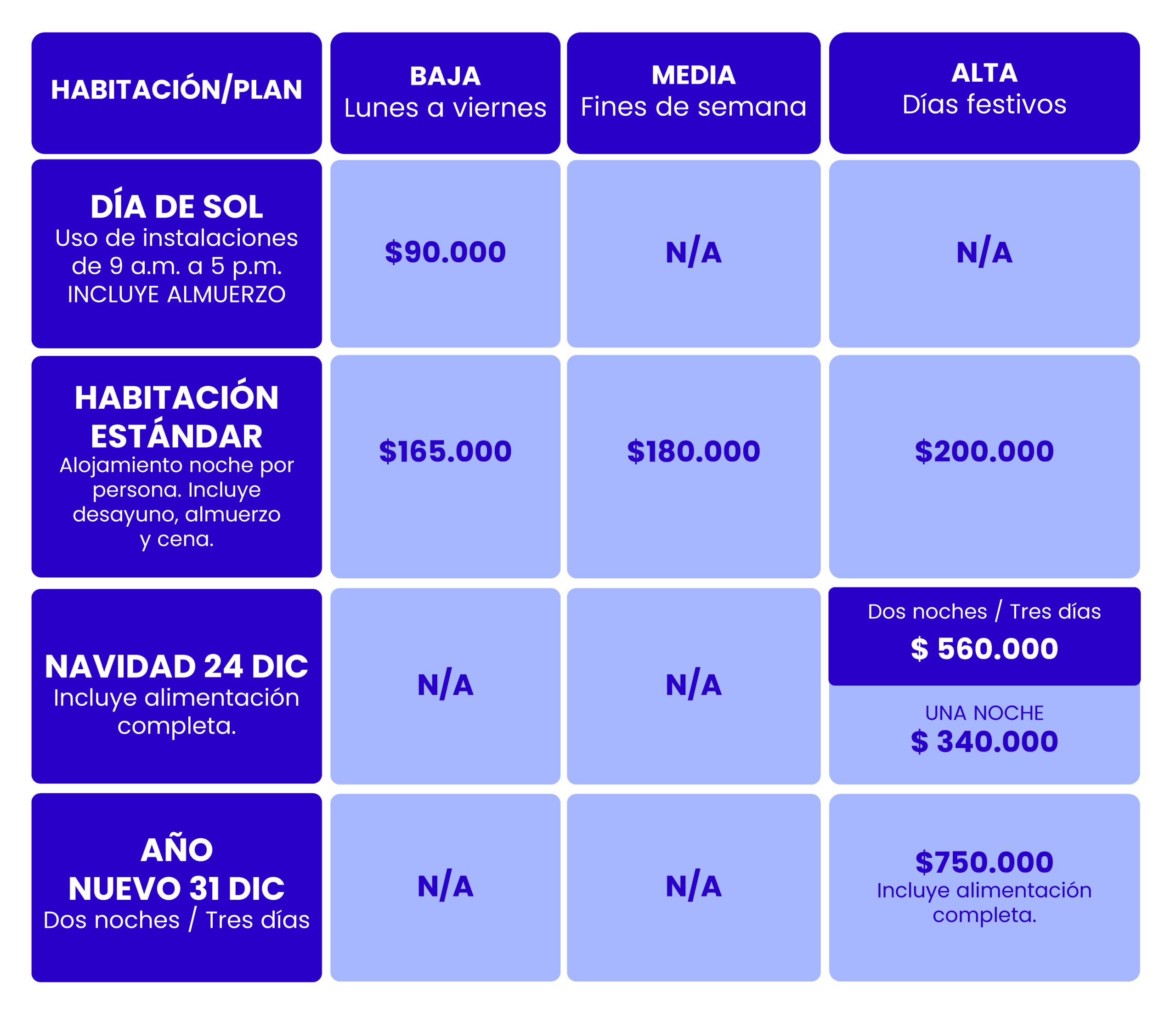 Temporada Alta: Fines de semana festivos, semana Santa (Jueves a sábado), semana de Receso (sábado 14 y domingo 15 de diciembre) Sábado 28 de diciembre a Enero 6.